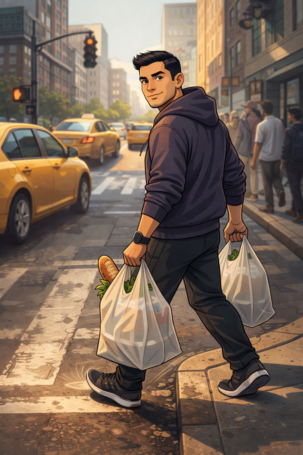 You carry groceries while scanning for traffic.