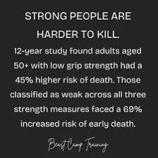 Research consistently shows that grip strength in middle-aged adults predicts survival rates decades later. Individuals with stronger grips had a 20–25% lower risk of all-cause mortality.